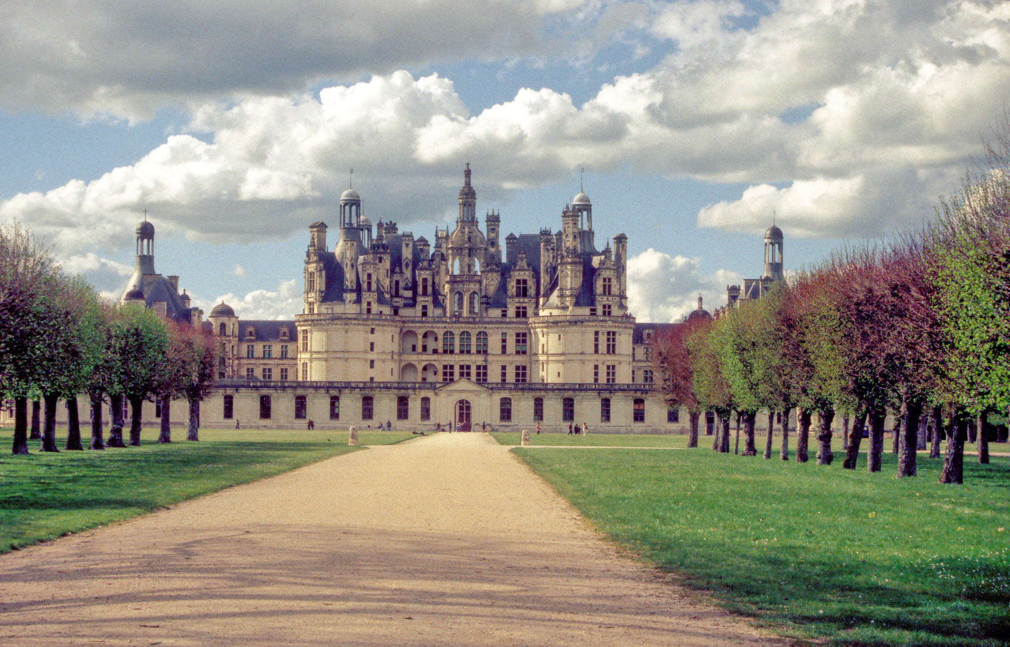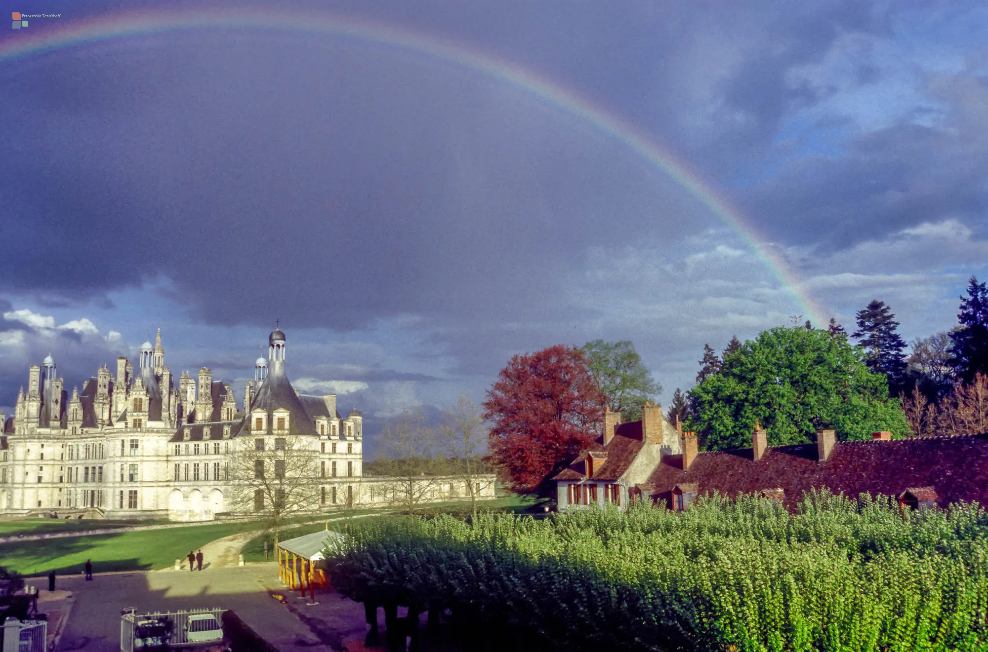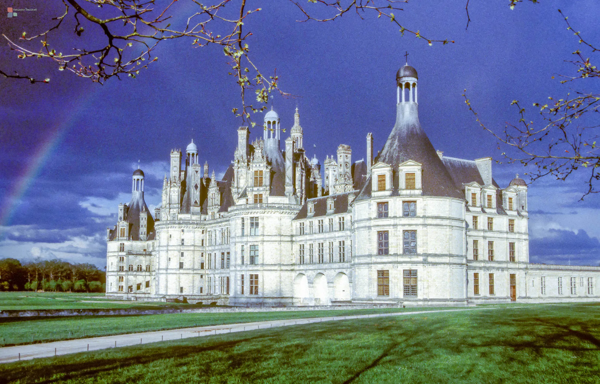 Das Schloss Chambord ist das größte Schloss des Loiretales. Es wurde in der ersten Hälfte des 16. Jahrhunderts unter König Franz I. als Prunk- und Jagdschloss bei Chambord errichtet und gilt als das prächtigste aller Loireschlösser. (Wikipedia). Im Jahr 1996 haben wir die erste Fotoreise entlang der Loire unternommen - ohne Smartphone, Booking.com, Google-maps, Google-earth etc. - und ohne gebuchte Unterkünfte. So war es immer wieder abenteuerlich, ob und wo wir eine Unterkunft bei den Reisezielen erhalten würden. Manchmal klappte es so gut, dass wir direkt aus dem erhaltenen Zimmer heraus eine fantastische Aussicht auf das geplante Fotomotiv erhalten konnten - so auch hier, am Schloss Chambord. Dank der perfekten Lage der Unterkunft konnten wir aus einem idealen Blickwinkel (s. Bild 7) das berühmte Schloss direkt vom Dachgeschoss aus vor den dramatischen Gewitterwolken - schließlich sogar mit rahmenden Regenbogen - fotografieren.