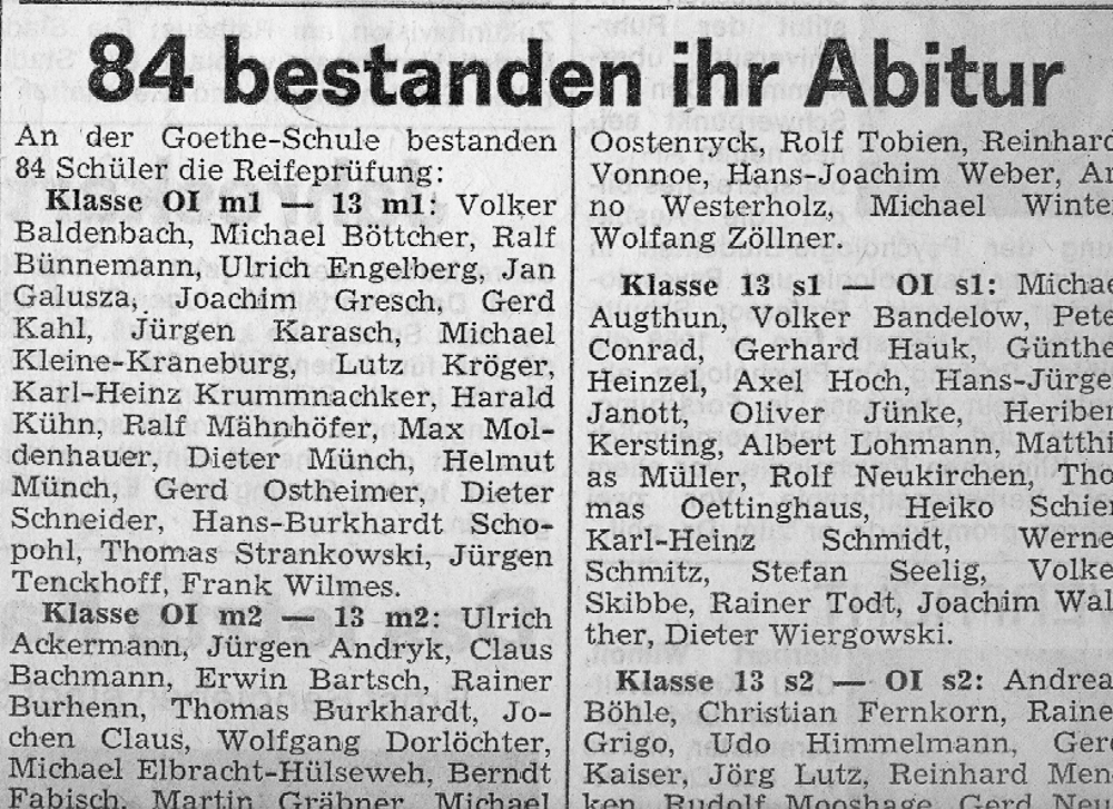 Max hatte 1973 zwei Klassen auf dem Gymnasium übersprungen, um mit uns schließlich 1974 in der OIm1 das Abitur abzulegen. Max war ein sympathischer und freundlicher Überflieger mit einem gehörigen Schuss Leibniz, denn alles viel ihm leicht, interessierte ihn - auch das Scherzen. Unvergesslich bleibt sein Spaß mit unserem Klassenlehrer Keipert im Neuschnee vor unserem Pavillon. Keipert auf dem Weg zum Unterricht, den Blick starr nach unten gewandt, um den seltsamen Barfußspuren (von Max) im sonst unberührten Schnee zu folgen, riss die Tür zu unserem Klassenraum auf und ... stürmte in den Schneemann, den wir hinter der Tür aufgebaut hatten.