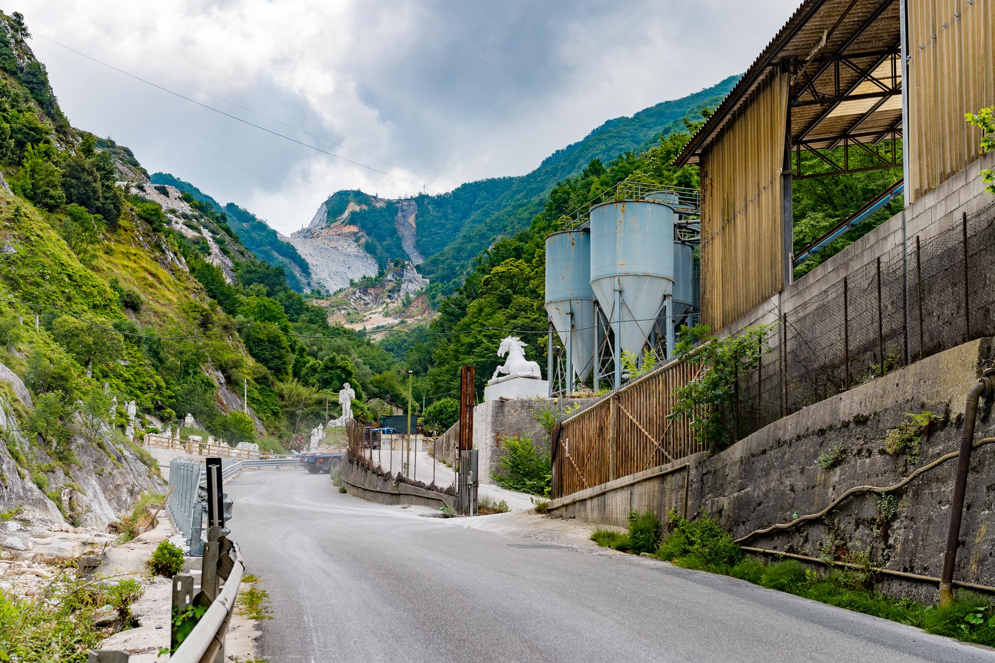 In den Apuanischen Alpen liegt Carrara, ein Ort, der weltweit für seinen Marmor bekannt ist. Schon die Zufahrt zu den Steinbrüchen ist bemerkenswert, weiße Statuen säumen den Weg der Bergstraße hinauf genauso wie verfallene Lastwagen am Straßenrand, bei denen man noch die schweren Marmorblöcke auf der Ladefläche sieht. An den Bergwerken angekommen, kann man verschiedene Besichtigungstouren buchen. Wir entschieden uns für die Marmortours und mit einem Kleinbus ging es zu den Abbaugebieten durch einen langen Tunnel in den Berg hinein.