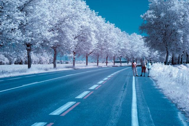 Alleen sind ein besonders schönes Motiv für Infrarotaufnahmen. Die weißen Blätter der Bäume im Sommer im Kontrast zu dunklen Straßen bringen eine winterliche Anmutung hervor. Doch was die Augen sehen, führt schnell zu staunenden Zweifeln. T-Shirts im Winter? Da die gebräuchlichen Infrarot-Langpassfilter knapp oberhalb von 700 nm geringe Anteile des sichtbaren Spektrums durchlassen, können diese mit entsprechenden Prozeduren (z.B. mit Adobe Lightroom, Photoshop) in der Aufnahme sichtbar gemacht werden.