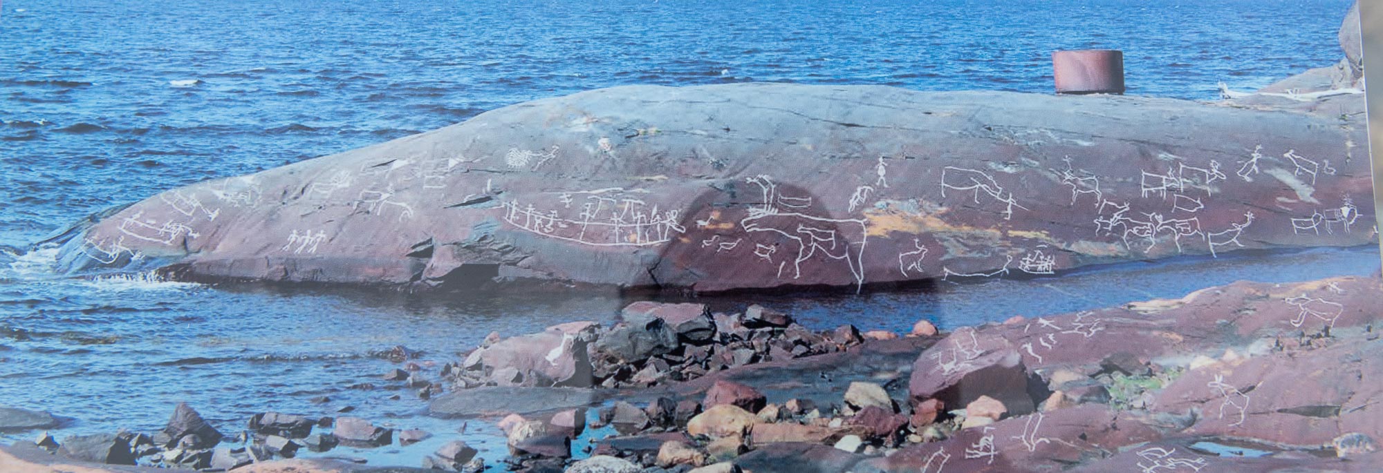 Archäologen haben einige der Felsritzungen mit roter Farbe ausgemalt, so dass man die einzelnen Abbildungen gut erkennen kann. Bei den Steinen am Ufer ließ sich dies auf Grund verschiedener Wasserstände nicht realisieren aber die ersten Fotos dieses Beitrags zeigen schön, was man bei reiner Betrachtung der Steinformationen leicht übersehen kann. So kann man im Museum eine der Steinformationen an der Küste im Fjord "nachgezeichnet" sehen.