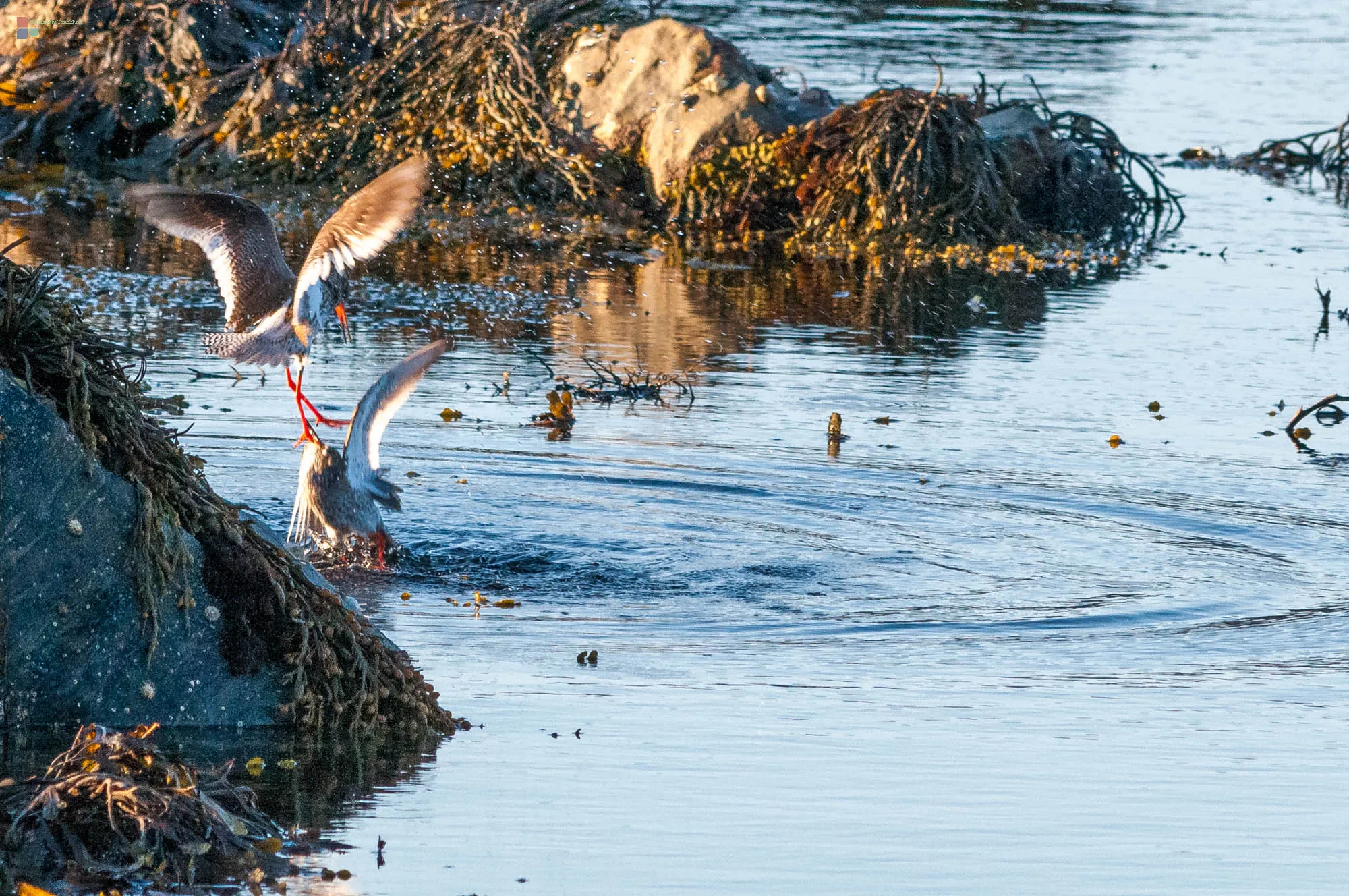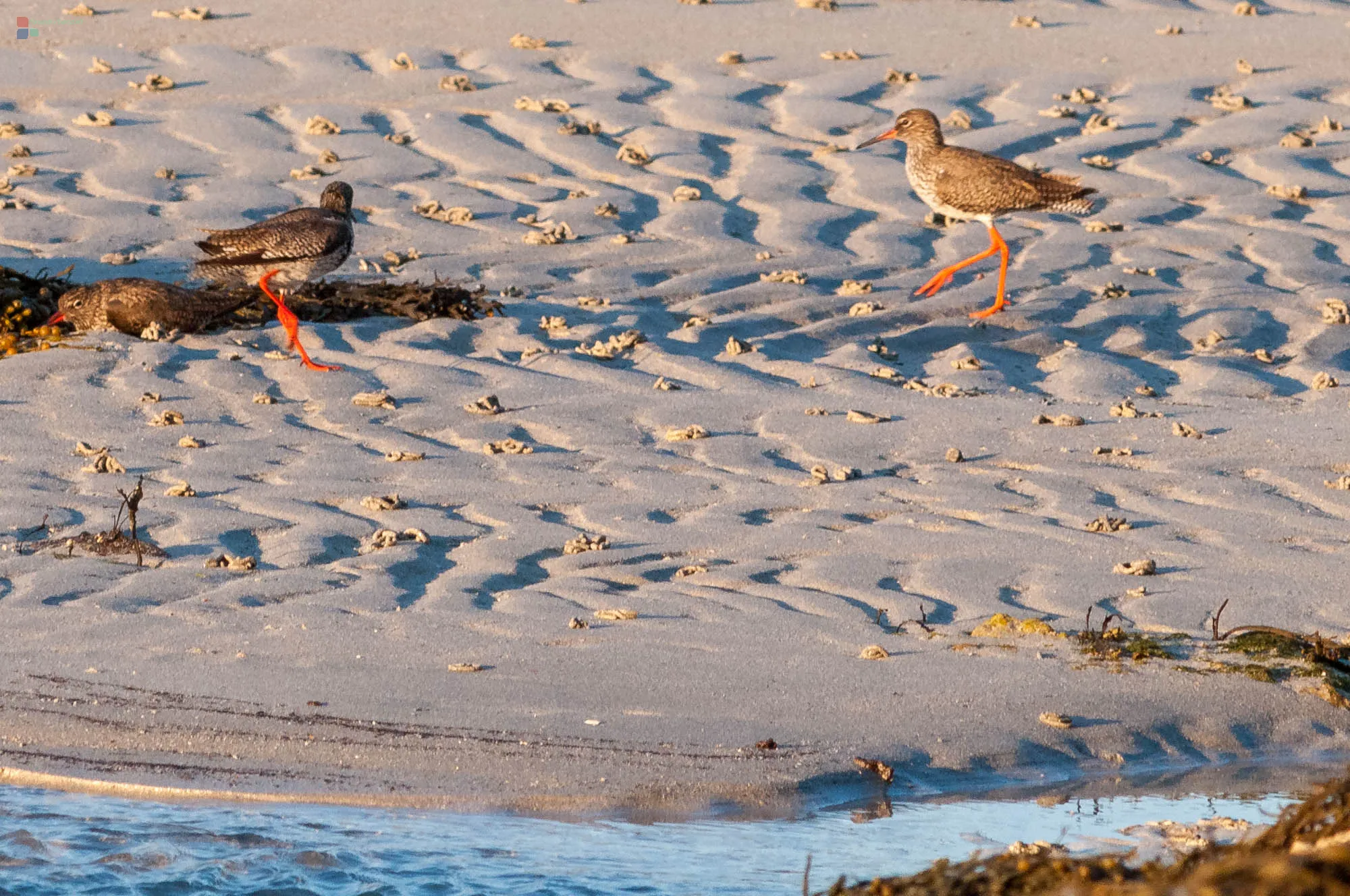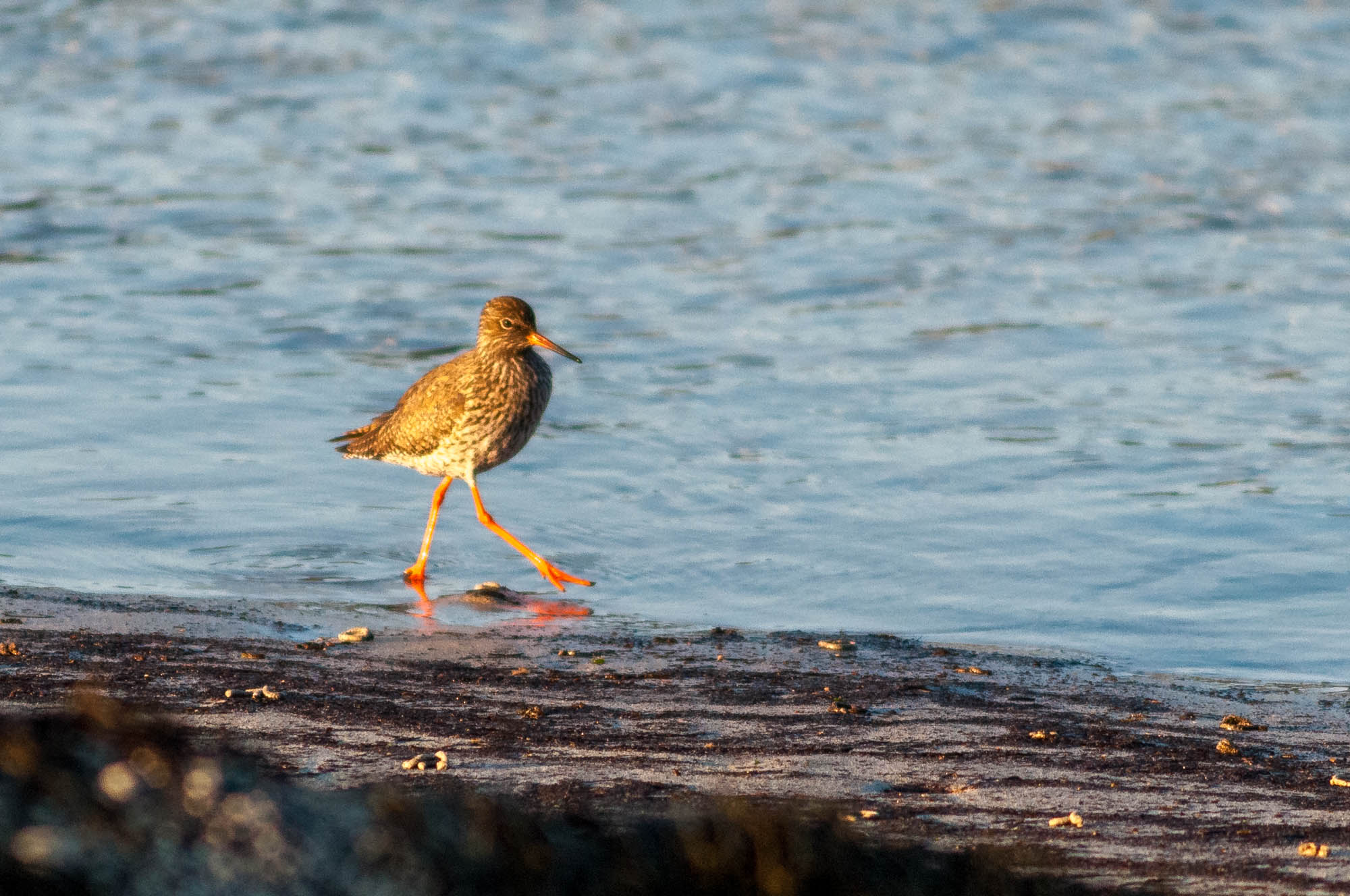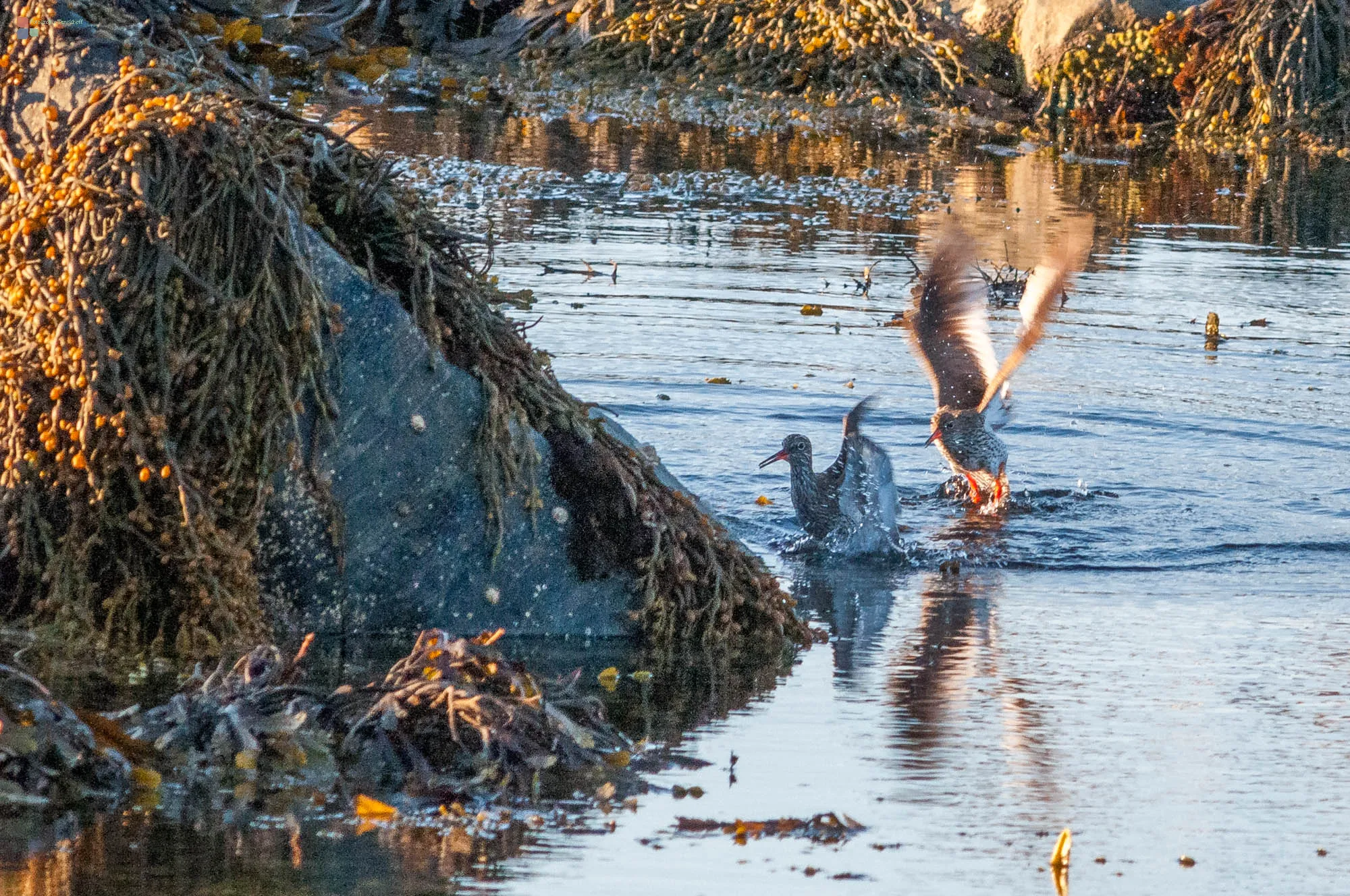 Der Rotschenkel zählt zu den Schnepfenvögeln (Scolopacidae) in der Ordnung Regenpfeiferartige (Charadriiformes) und lebt in fast ganz Eurasien an Küsten und Gewässern. Mit rund 30 cm Größe ist er ausgewachsen etwas kleiner als sein Verwandter, der Grünschenkel. In Deutschland kann man ihn gut am Wattenmeer beobachten. Hier zeigt er sich auch gerne in größeren Ansammlungen. Wir haben ihn direkt vom Haus aus auf den Lofoten fotografieren können, wo wir unser 500 mm f/4,0 Nikkor bequem auf der Veranda aufbauen konnten. Von hier ließ sich das fröhliche Treiben der Vögel gut beobachten und ablichten.