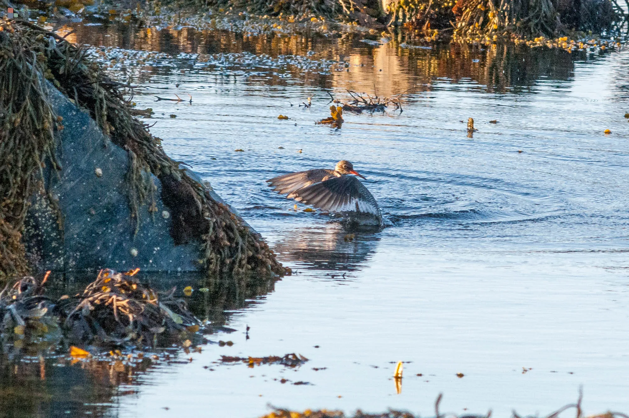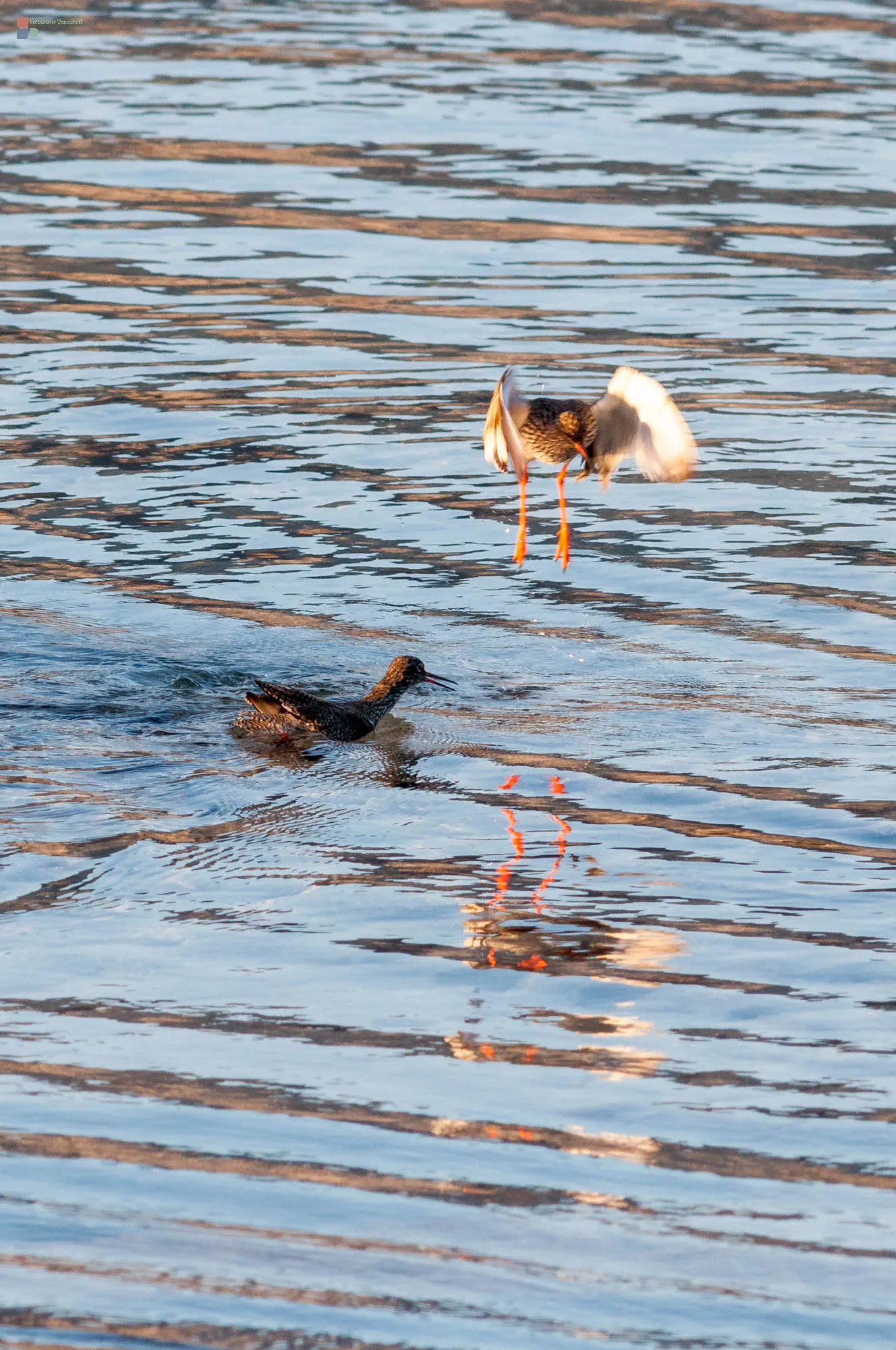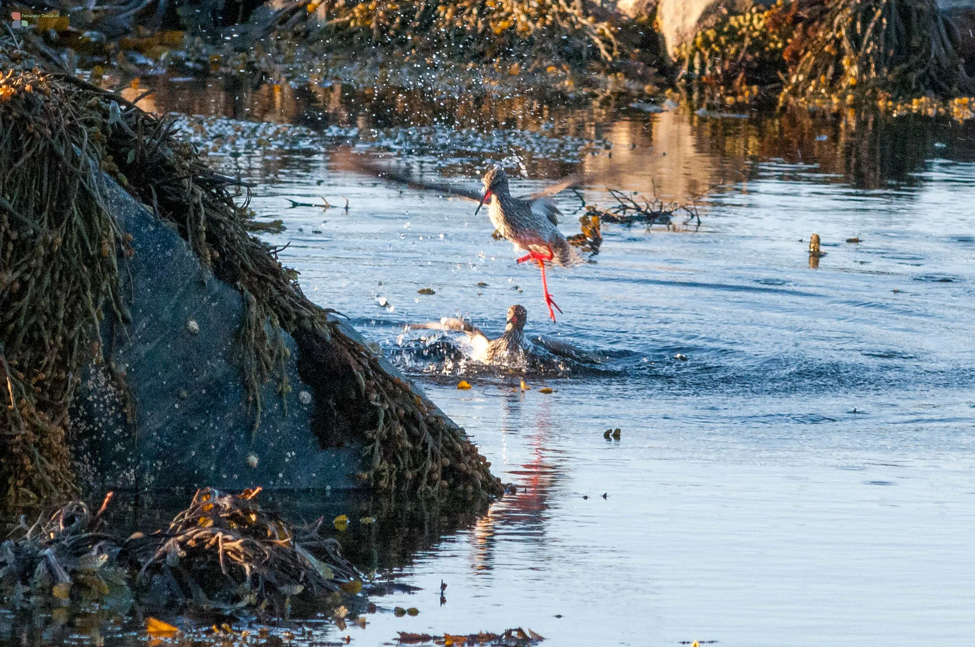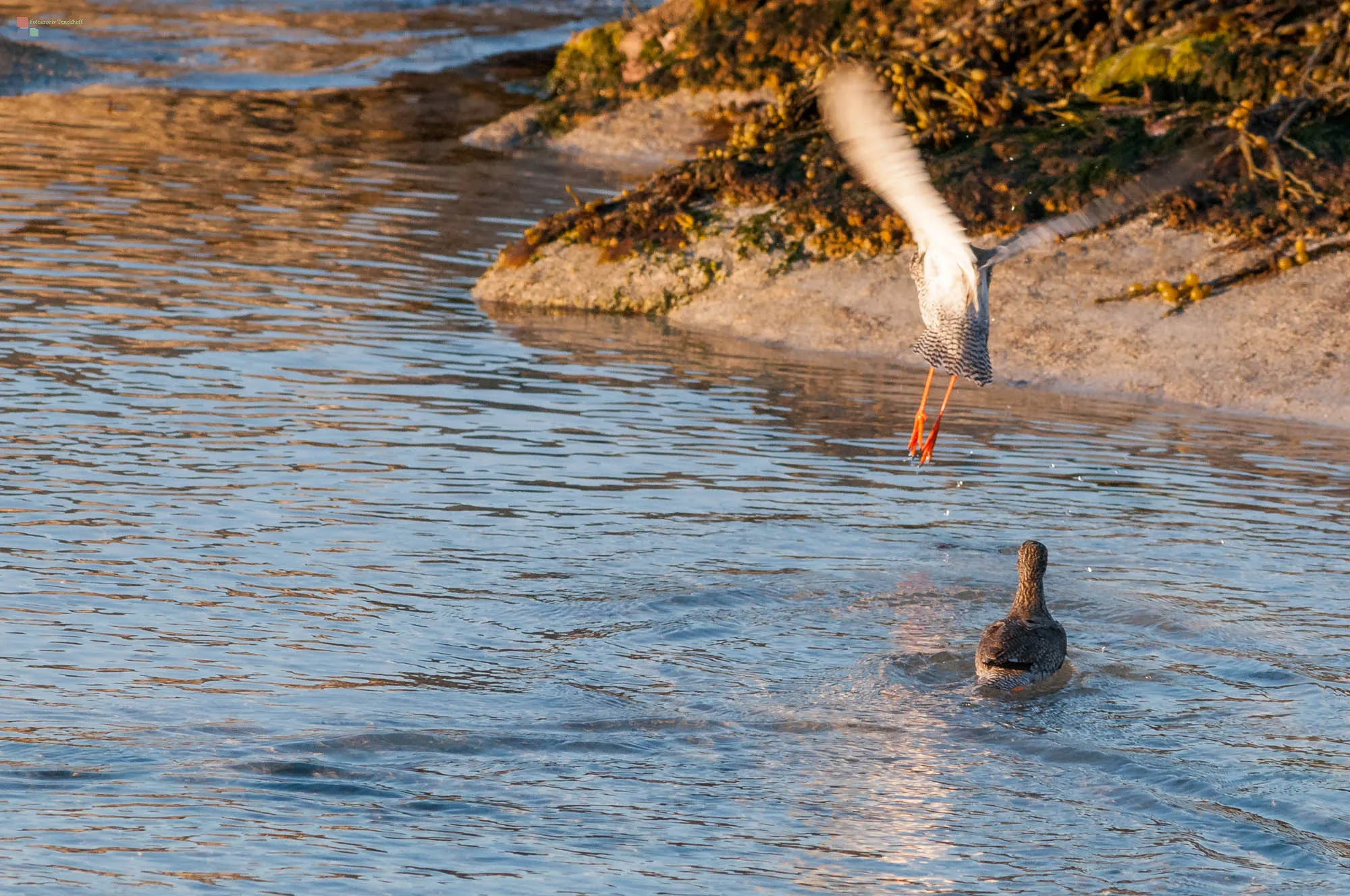 Der Rotschenkel zählt zu den Schnepfenvögeln (Scolopacidae) in der Ordnung Regenpfeiferartige (Charadriiformes) und lebt in fast ganz Eurasien an Küsten und Gewässern. Mit rund 30 cm Größe ist er ausgewachsen etwas kleiner als sein Verwandter, der Grünschenkel. In Deutschland kann man ihn gut am Wattenmeer beobachten. Hier zeigt er sich auch gerne in größeren Ansammlungen. Wir haben ihn direkt vom Haus aus auf den Lofoten fotografieren können, wo wir unser 500 mm f/4,0 Nikkor bequem auf der Veranda aufbauen konnten. Von hier ließ sich das fröhliche Treiben der Vögel gut beobachten und ablichten.