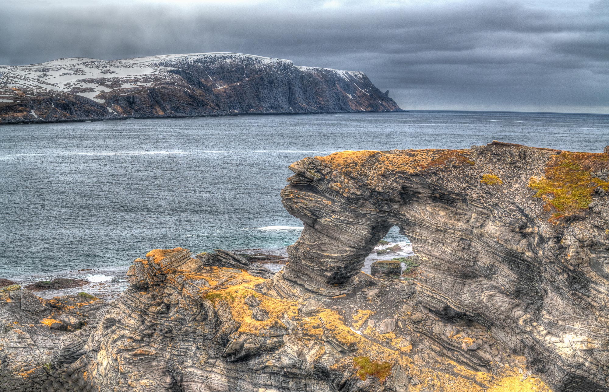 Die Felsformation des Kirkeporten ist ein Highlights, das man gut von Skarsvåg aus erwandern kann. Hat man diesen Küstenabschnitt schließlich erreicht, so bietet der Kirkeporten einen ganz besonderen Blick: Durch ihn schaut man über den Mefjord auf das etwa sechs Kilometer entfernte Nordkap-Plateau mit seinem berühmten Nordkap-Horn.