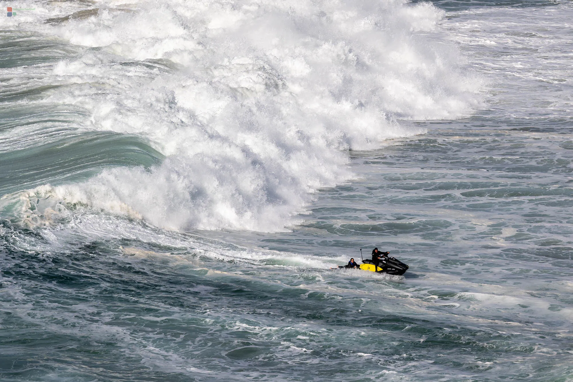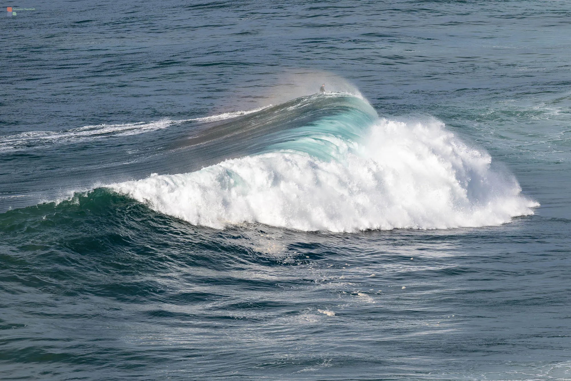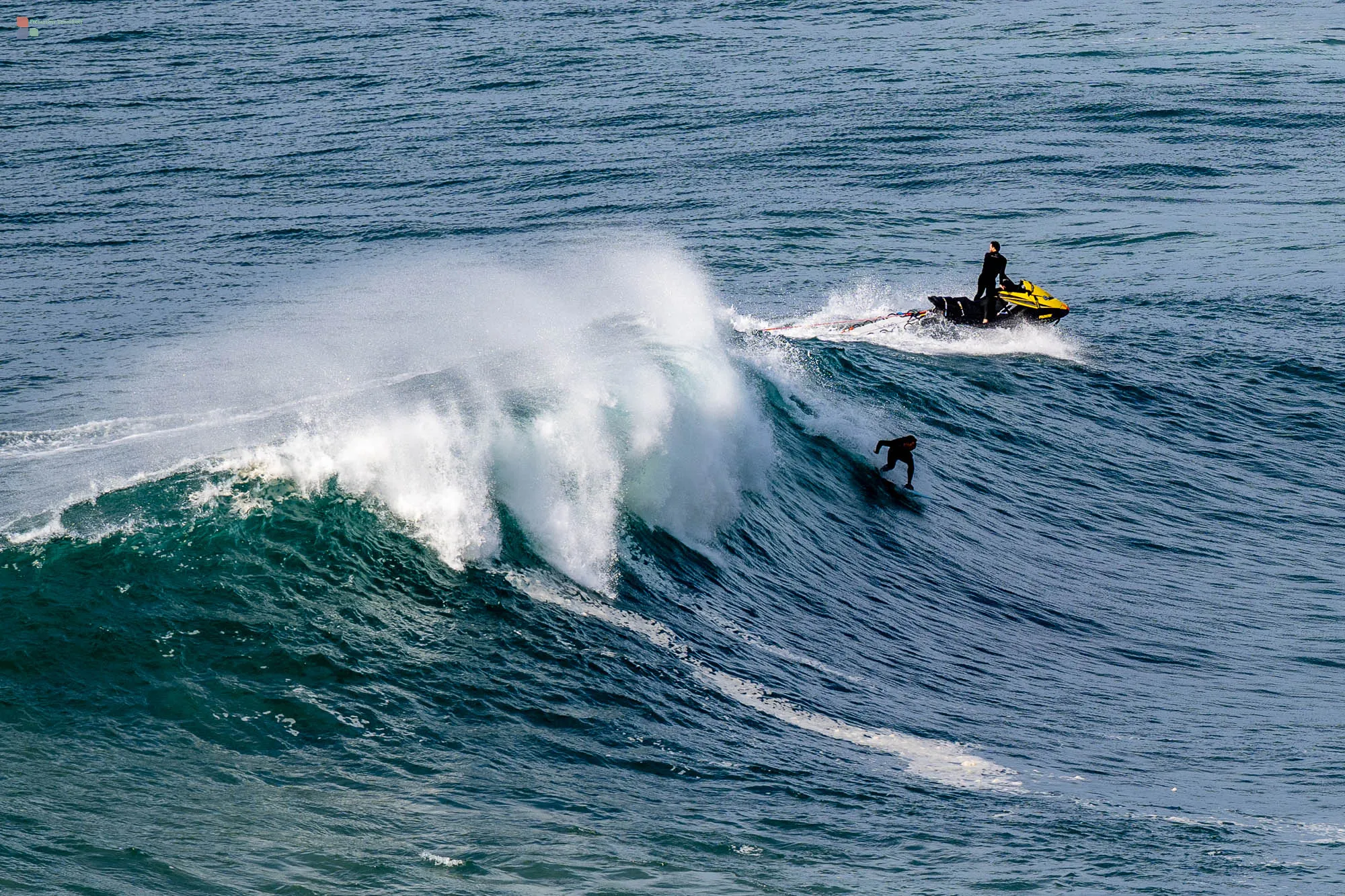 Draußen beginnen die Jetskis damit, die Surfer an die Kämme der Wellen zu ziehen. Von oben sehen sie aus wie winzige Punkte zwischen riesigen, rollenden Wänden. Und doch folgt alles einer Art Choreographie: Mut, Physik und ein fast meditativer Fokus verbinden sich, während die Fahrer die Wasserberge herabgleiten.