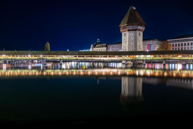 Bei Einbruch der Dunkelheit leeren sich die quirligen Straßen von Luzern und die Touristenströme nehmen ab. Jetzt schlägt die Blaue Stunde, die mit ihren besonderen Lichtverhältnissen fotografische Motive in einer besonderen Stimmung erscheinen läßt. Bei günstigen Wetterbedingungen zeigen sich diese besonderen Motive sogar mit ihren Spiegelungen in der ruhigen Reuss. Die nötigen Langzeitbelichtungen gelingen z.B. gut mit dem Wahrzeichen von Luzern, der Kappelbrücke, der zweitlängsten Holzbrücke Europas. Sie verbindet den achteckigen Wasserturm aus dem 1300 Jahrhundert mit den Ufern der Reuss. Der Turm diente mal als Wachturm und Eckpfeiler der Stadtbefestigung, aber auch als Kerker und Folterkammer.