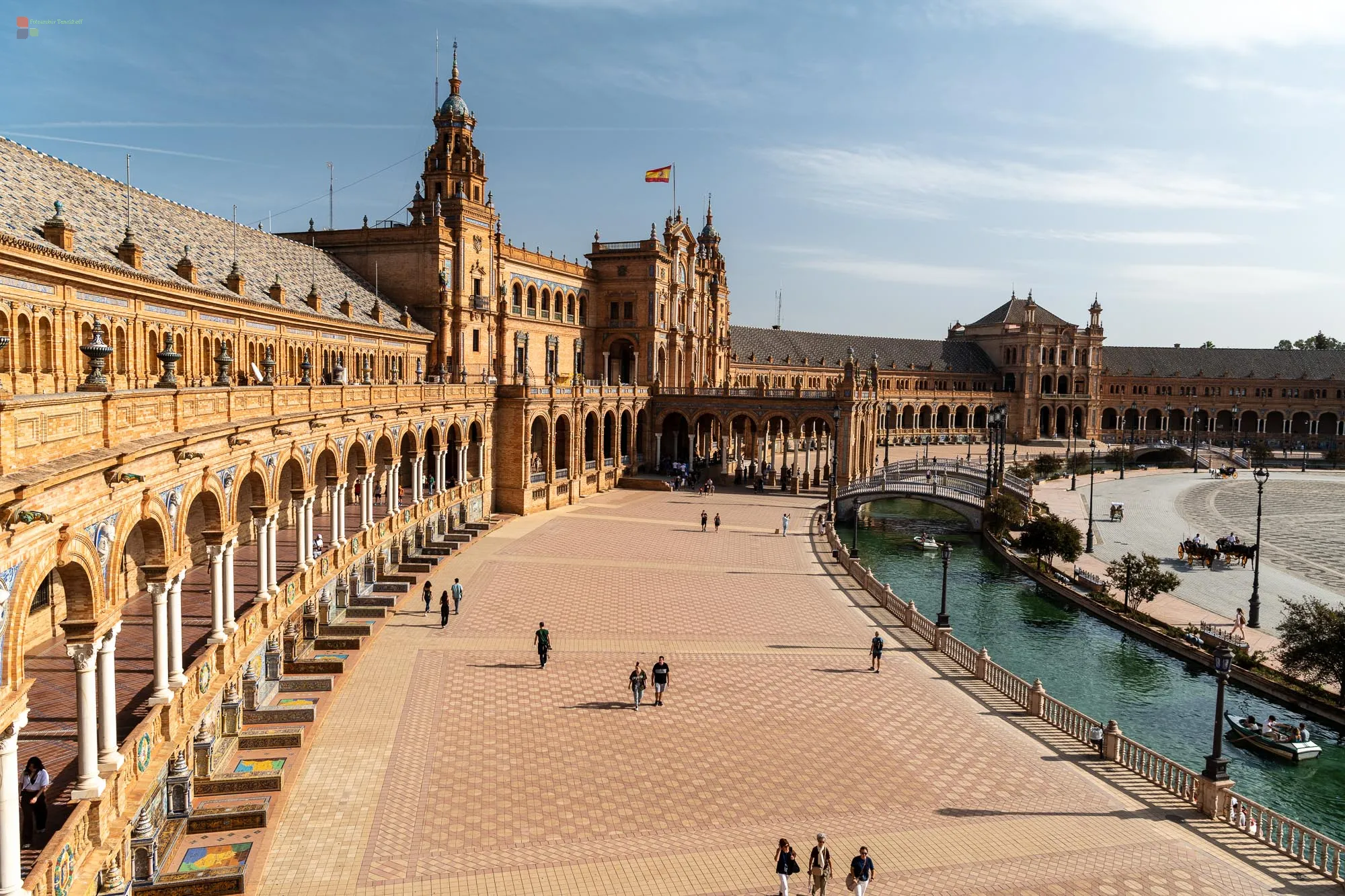 Die Plaza de España in Sevilla wird nahtlos von einem halbkreisförmigen Gebäude umschlungen und symbolisiert eine Umarmung der früheren südamerikanischen Kolonien Spaniens. Als Kulisse für beeindruckende Flamencotänze bringt er Künstler:innen hervorragend zur Geltung, die trotz der hohen Temperaturen während unseres Besuchs eine Performance darboten, die Marathonläufern alle Ehre bringen würden.