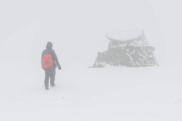Doch das änderte sich mit steigender Höhe schnell. Aus den breiten Wegen wurden enge Felspartien und schließlich ging es im Nebel über Schnee und Eis. Manchmal tauchten Felsbrocken als Schemen im Nebel auf und verschwanden ebenso schnell wieder, so dass sie nicht als Wegpunkt dienen konnten. Eisern blieben wir auf dem Track, den unser GPs zeigte und rund 100 Höhenmeter vor dem Gipfel tauchte eine größere Felsformation im Nebel auf, die sich als steinerne Gipfelhütte entpuppte, und motivierte Karin zu dem Ausruf: "Und wenn ich auf allen Vieren kriechen muss, bis dahin schaffe ich es!"