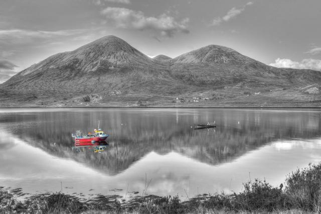 Es ist windstill und die Oberfläche des Loch Linnhe bei Fort William in Schottland ist sehr ruhig - keine Welle läßt das rote Boot schwanken, das in der Spiegelung eines Berggipfels ankert - eine Szene wie geschaffen für einen Color-Key Bild.