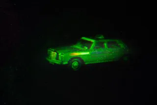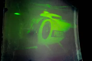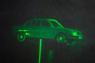 Dieser Beitrag zeigt ein Weißlichthologramm, das mit einem Argon-Laser aufgenommen wurde und im Licht einer Taschenlampe erscheint.