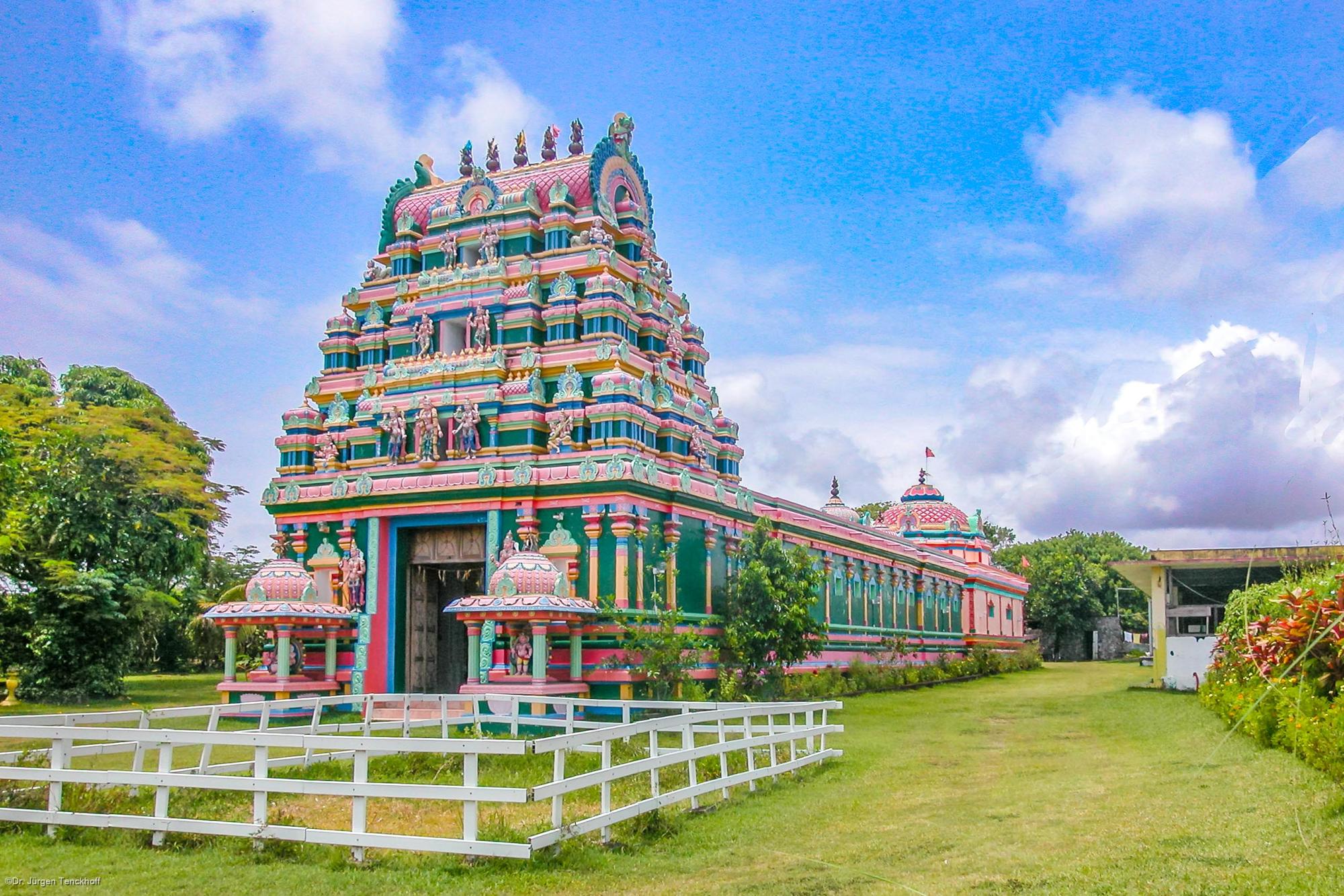 Der Tempel ist der Göttin Pandialé gewidmet und wurde Anfang der 1990er Jahre von tamilischen Handwerkern aus Madras errichtet. Seine Architektur folgt dem südindischen Stil: ein hoher, mit Figuren geschmückter Gopuram, dessen Etagen sich übereinander auftürmen, leuchtend in Türkis, Rosa, Ocker und Grün. Jede Ebene erzählt in Reliefs und Skulpturen Geschichten aus der hinduistischen Mythologie – von Vishnu, Shiva, Ganesha und den vielen Gestalten göttlicher Energie.