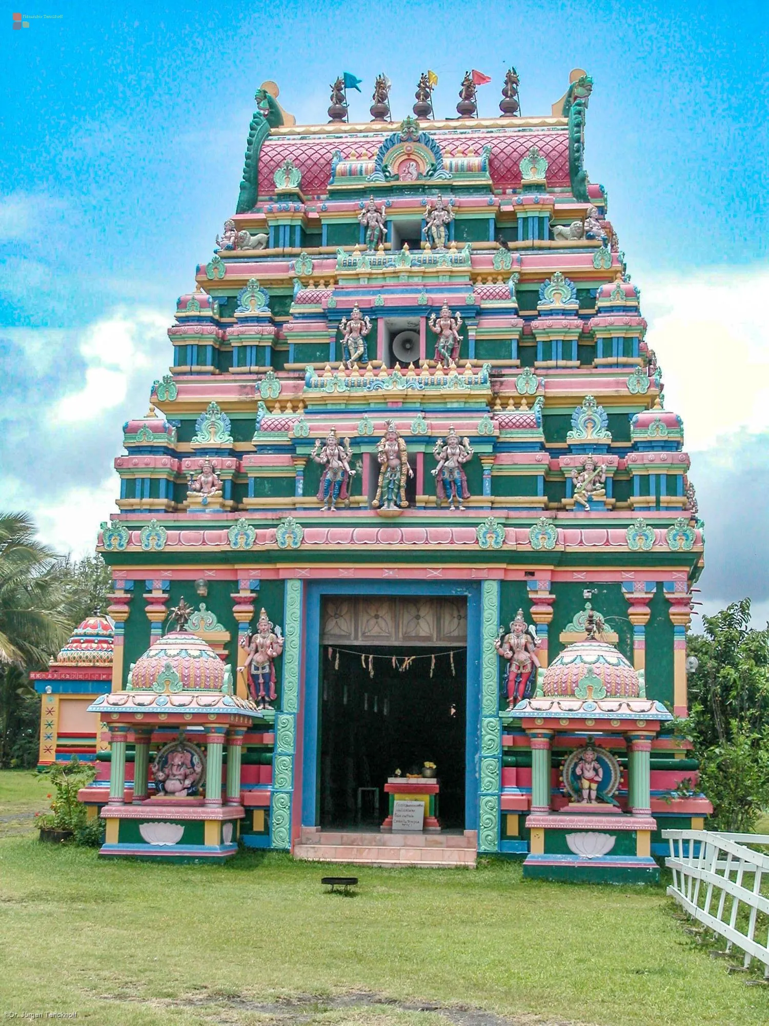 Während einer dreiwöchigen Reise über die Insel La Réunion im Jahr 2002 besuchten wir bei strahlend blauem Himmel den Temple du Colosse in Saint-André – einen der prächtigsten Hindutempel der Insel. Er steht auf einer weiten, grünen Wiese, umgeben von Palmen und Zuckerrohrfeldern – ein Ort, der in seiner farbigen Stille beeindruckt.