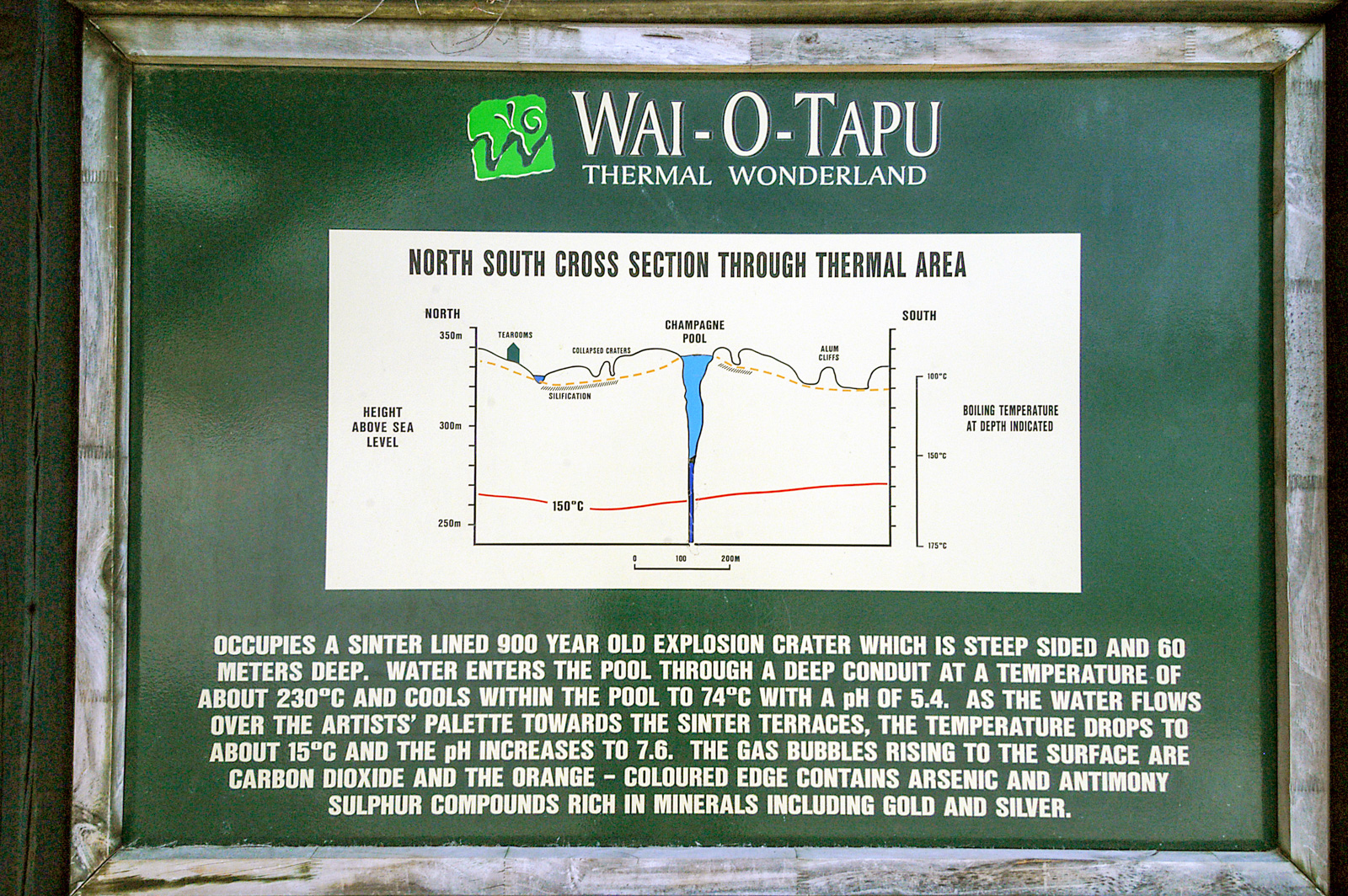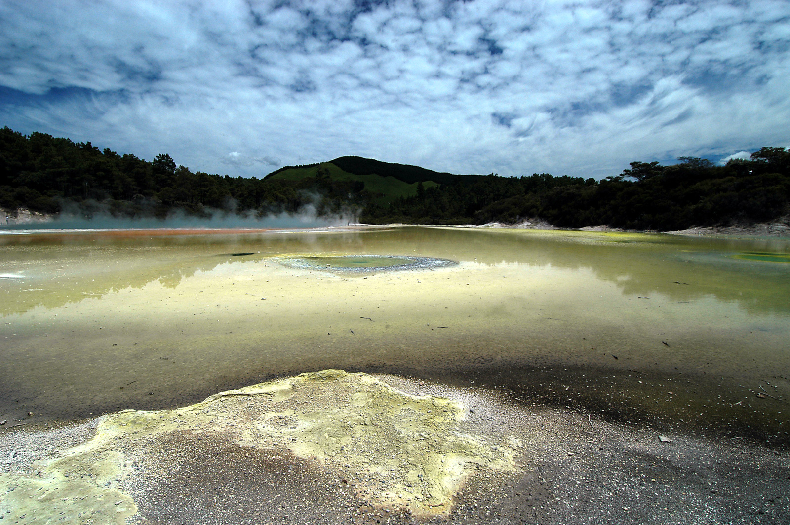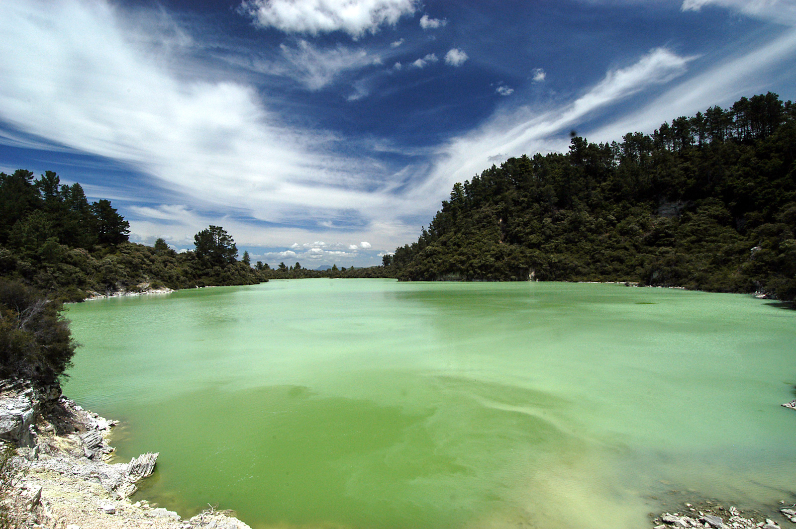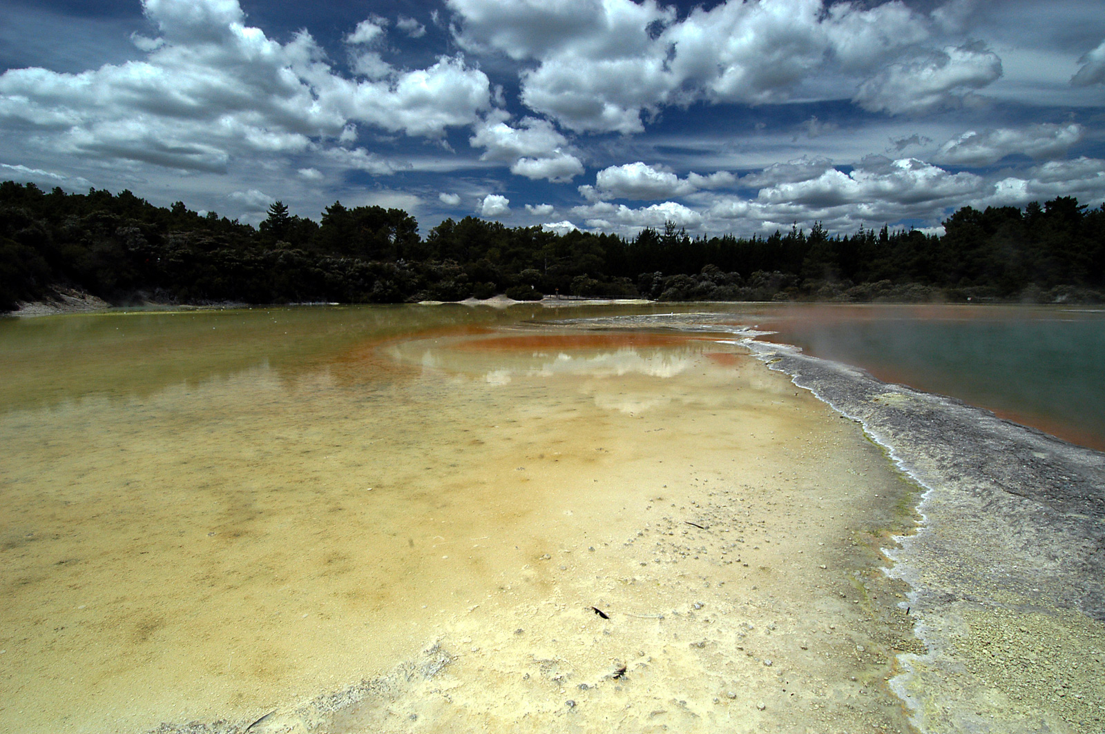 Dass sich die weite Reise von Deutschland nach Neuseeland mehr als lohnt, ist vielen bekannt. Aber dennoch übertreffen die vielen spektakulären Landschaften und überraschenden Begegnungen mit den unterschiedlichen Kulturen selbst hoch gesteckte Erwartungen. Ein Höhepunkt von Ausflügen auf der Nordinsel zum Wai-O-Tapu-Wonderland ist z.B. die Erkundung des sogenannten Champagnerpools, - ein grüner See mit einer orangenen Umrandung, aus dessen Tiefe ununterbrochen kleine Gasblasen aufsteigen, was dem See seinen Namen gab.