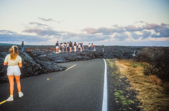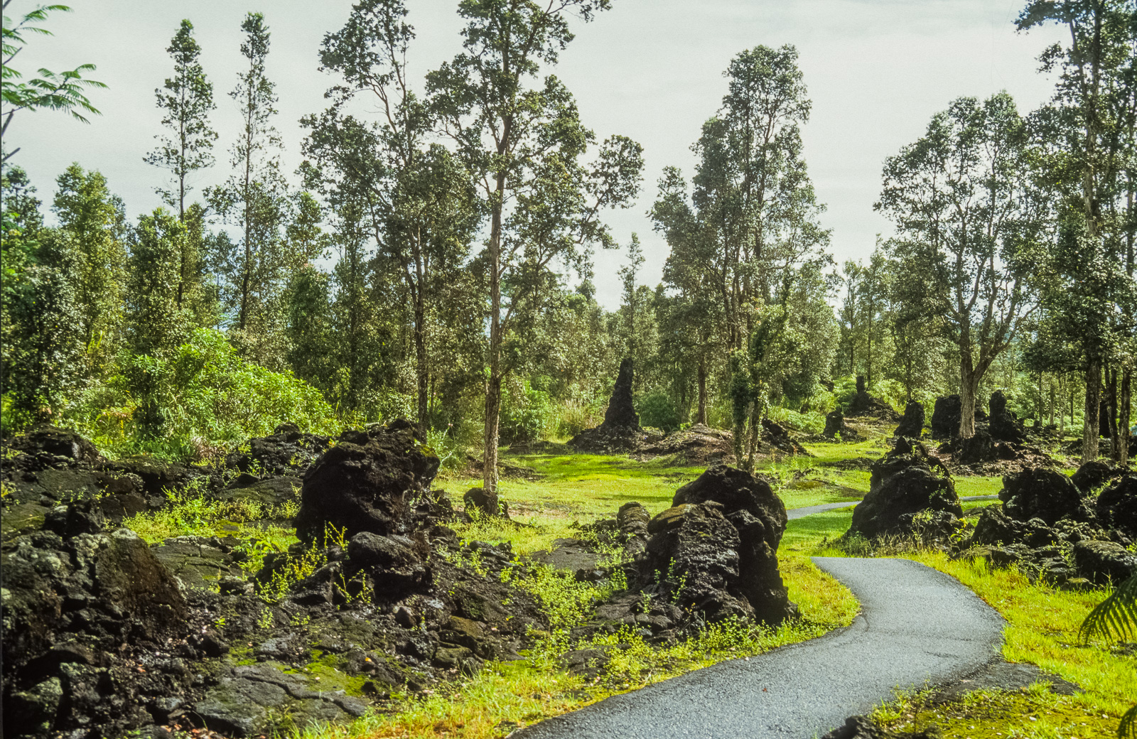 Auf der Küstenstraße von Big Island bot sich eine besondere Attraktion. Nachts war die durch einen aktuellen Lavastrom unbefahrbar geworden. Die nahegelegenen Vulkanspots zeigten entsprechende Überreste vergangener Lavaströme. Neben Baumskeletten konnte man Lavasäulen sehen, die durch die Ummantelung mit fließender Lava von Bäumen entstehen. Sind die organischen Baumreste verschwunden bleiben die Lavasäulen als Mahnmale stehen.