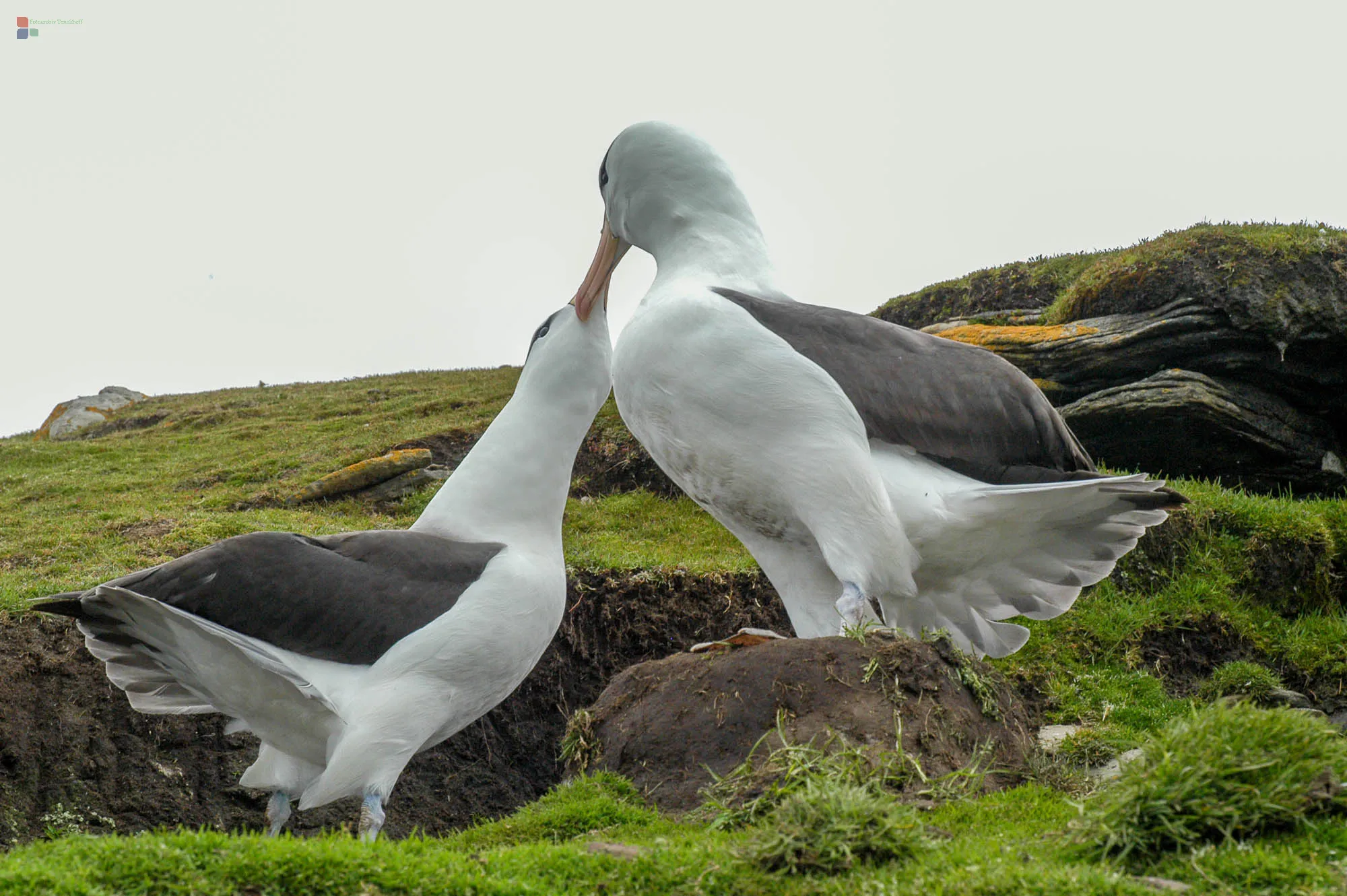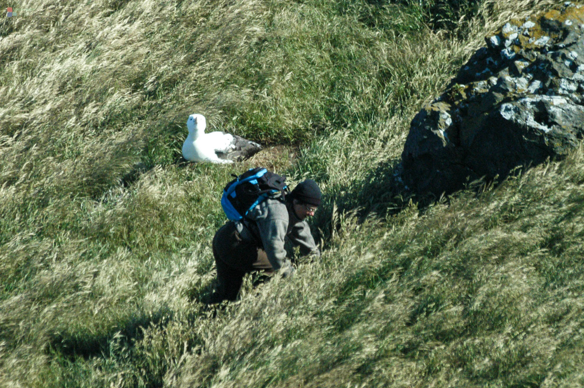 Die Mühe wird reich belohnt. Hier begegnet man den Schwarzbrauenalbatrossen Auge in Auge. Es ist ein unvergessliches Erlebnis, die Tiere so hautnah zu erleben. Da die Albatrosse von Saunders selten Kontakt mit Menschen haben, zeigen sie keinerlei Scheu und lassen sich weder durch meine Nikon D100 noch durch Karins Filmkamera stören. Mit einem 300mm-Objektiv ließen sich die Details ihrer prächtigen Erscheinung einfangen – die markanten schwarzen "Augenbrauen", das strahlend weiße Gefieder, die beeindruckende Spannweite und ... die tiefgründigen Augen.